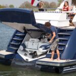 At the stern, the stairs leading down to the swim platform are very exposed and have no hand rail, which seems odd because it could compromise the safety of crew descending to the platform to gain access to the machinery space on one side or the crew’s quarters opposite. Fortunately this wouldn’t be a difficult fix. Access to the garage and the 12-foot Williams Jet tender is via a central transom door. The slipway eases launching and retrieval.