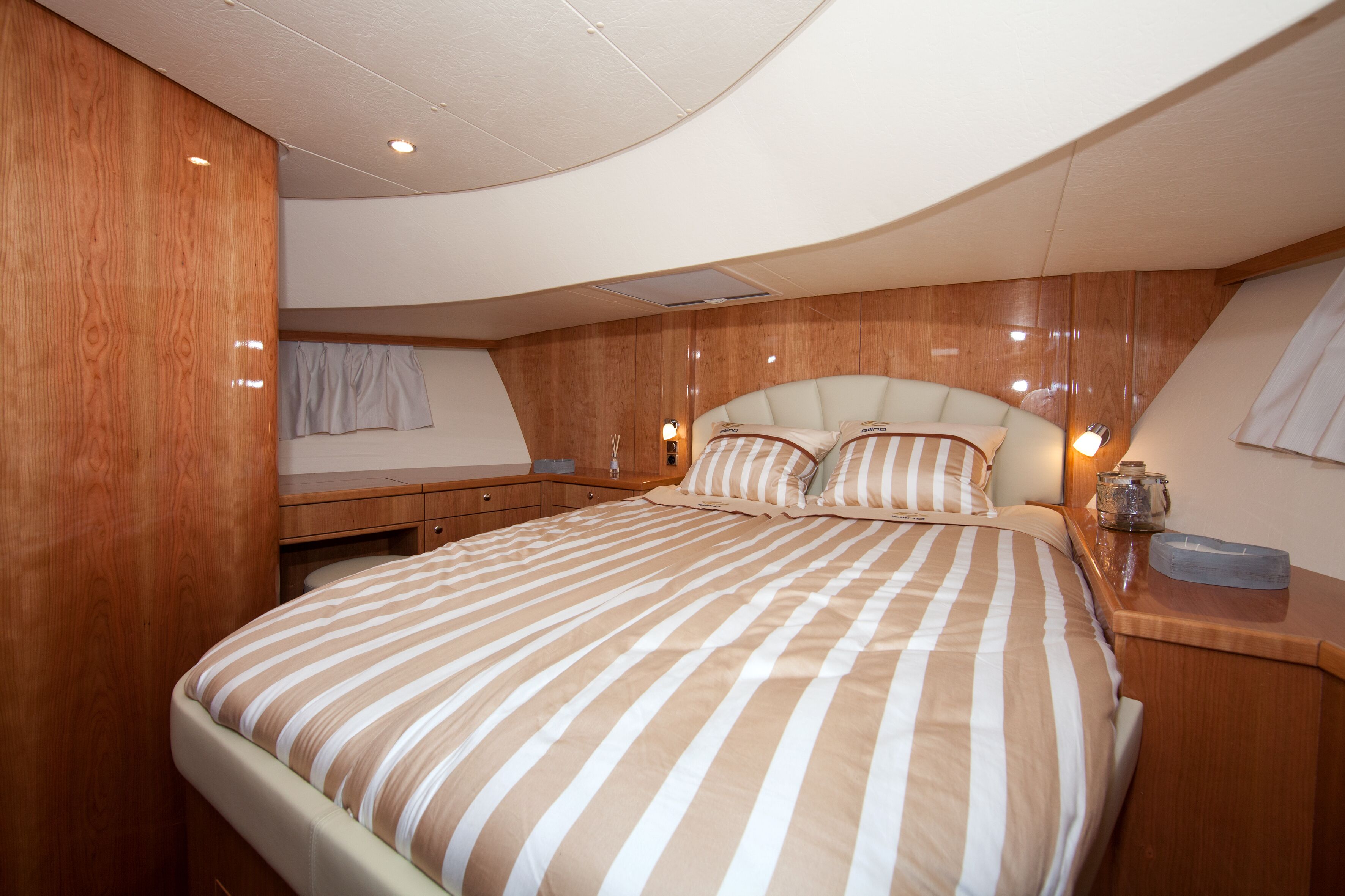 Continue aft and you enter the secluded, private master cabin, which has excellent storage and a sensible head. Cherry dominates the decor and makes the master stateroom a bit dark during the day because the small portholes don’t provide a lot of natural light. The same applies to the other cabins.