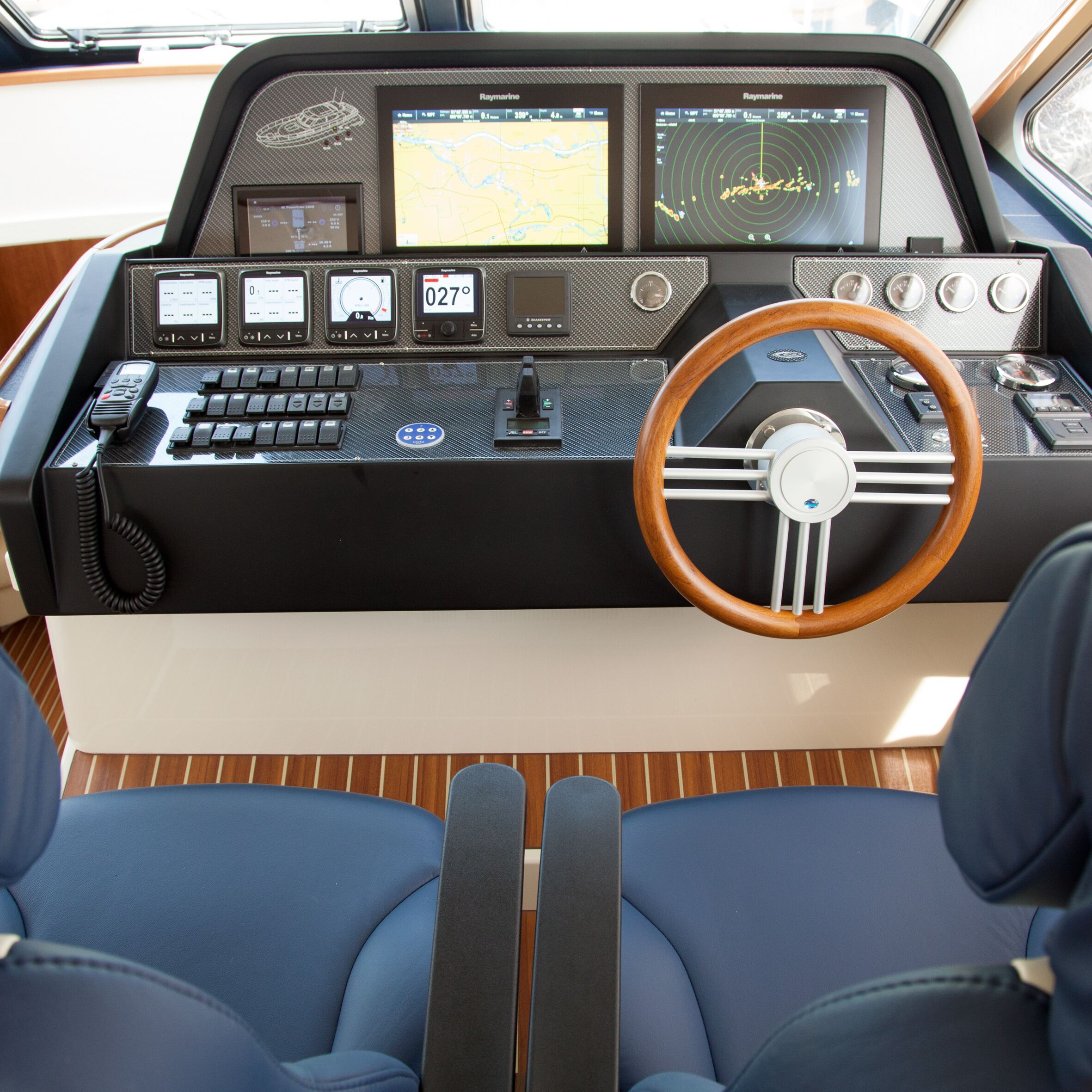 The interior design focuses on the saloon, and what a wonderful job they have done. Large windows all round give a great view of the outside and, more important, there is a 360° view from the starboard-side helm. Here there are two sprung seats facing an impressive dash dominated by two large Raymarine displays with a mass of smaller displays on the lower dash. The array of switches is impressive, but my preference would have been to give priority to more important switches, such as the wipers and the windlass control, and have them on the bottom row in the array, closest to the captain.