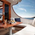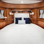 The standard option on the main deck includes a pair of straight settees to port and starboard in the main salon, which doubles as the interior helm. Double doors aft lead to a teak-decked cockpit with a large L-shape settee with table, complemented with a built-in refrigerator, grill and sink for outdoor meal prep. All cabinetry is custom crafted at Vicem by artisans who build vessels from 45 feet to 150 feet in length. Cabinet materials and countertops throughout can be specified to the owner’s taste.