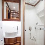 The 50 Classic has a standard two-stateroom configuration with ensuite heads and a galley. The second head doubles as a day head, with dual entry either from the corridor and the twin guest cabin. The master cabin has a queen-size island berth, dual hanging lockers and a large head with a separate shower.