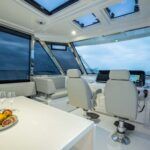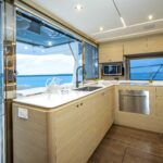 The galley-down option converts the space from the fifth stateroom, allowing the salon to take on a formal dining layout with a seating lounge. The transit windows in the full-beam master stateroom provide panoramic views. In the salon, panoramic tempered-glass side windows add to the relaxation ambience. In the cockpit, the dining area is adjacent to an indoor/outdoor bar. The space includes a table with chairs.