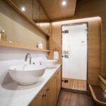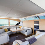 Beyond the gated transom openings is a swim platform that will support a tender with a concealed davit system. A passerelle is optional. Standard propulsion is a pair of 480-hp Volvo Penta D6 diesels. According to the builder, top speed should be in the high-20-knot range.