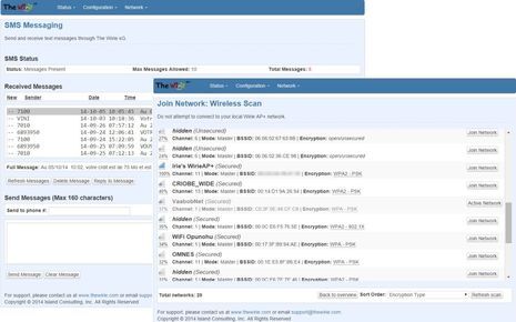 The background screen in this collage shows how you can send SMS messages via the WiriePro interface, which is quite handy for adding credit to prepaid SIM cards. In fact, you can see that Wirie developer Mark Kilty has been doing just that, in French. The inset WiFi scan screen — which seems nicely simplified since I tested the original WirieAP in 2011 — also has a French Polynesian flavor, and that’s because the sailing development lab Irie has gone many miles and done lots of Internet chasing since I first profiled the product.