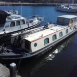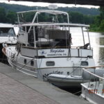 Our boat is named Nepidae (pronounced Nep a day, but also could be Nep a dee). She is a 1986, 43′ Albin Sundeck. Wikipedia defines Nepidae as, “Nepidae is a family of exclusively aquatic Heteropteran insects in the order Hemiptera.[1] They are commonly called water scorpions for their superficial resemblance to scorpions, due to their raptorial forelegs and the presence of a long slender process at the posterior end of the abdomen, resembling a tail”. A water scorpion prefers, “slow-moving freshwater habitats” which our trawler likes. I have attached a picture of the stern of our boat which shows the addition of our boat name on the skirt of the sundeck. I felt with the dinghy on the stern a clear view of the name was necessary as shown in the 2nd picture where we are on the wall at Waterford, NY. IF you check the documentation site, we are the only boat of that name. Oh, BTW, my wife and I are both Scorpio’s.