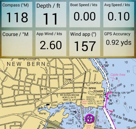 While I also did a lot of radar and sonar testing on the way to New Bern — which you’ll be hearing about eventually — I spent further Android time with the Naviotab “Future of Marine Navigation” seen above. What seems to be happening here is that an established California “weather gadgets” distributor has sourced a high-spec IP67 waterproof Android tablet from China, which it’s marketing to boaters with a year warranty, tech support, bundled apps and appropriate accessories. One included app is Boat Beacon, seen above with the optional Naviotab mount. It’s great to see that this app and Marine Traffic both have much better online AIS coverage of this area than they did two years ago — thank you, onshore volunteers! — but much of the coast still lacks dense enough coverage to use Boat Beacon reliably without its boat connection.