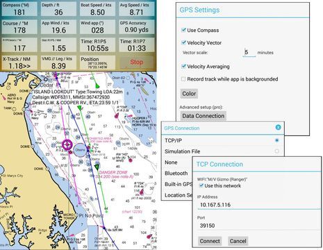 Memory-Map is a good standalone charting app, as I detailed when their Android edition first came out in early 2012. Going down Chesapeake Bay I still would have had constant GPS plotting on a well-rendered NOAA raster chart as well as easy route making and the right data displays to follow one (even if I have more than a mile of X-Track error in this particular case). But isn’t the tablet a much better navigation tool when it also displays AIS targets, depth, and even the wind speed/direction that motivated me to alter course? On Gizmo it was relatively easy to add all this info as shown in the dialog boxes to the right. I simply set up a TCP/IP connection using the address and port # that’s listed in the setup software that comes with the Vesper XB8000 AIS transpondermultiplexer under test. I could have the Nexus7 tablet talking directly to the Vesper’s WiFi, but a bonus feature of the latter is its ability to join an onboard network; thus, the tablet remains connected to the WiFi router named “M/V Gizmo (Ranger)” and if that’s online I can download charts to Memory-Map if needed, check the weather forecast, etc.
