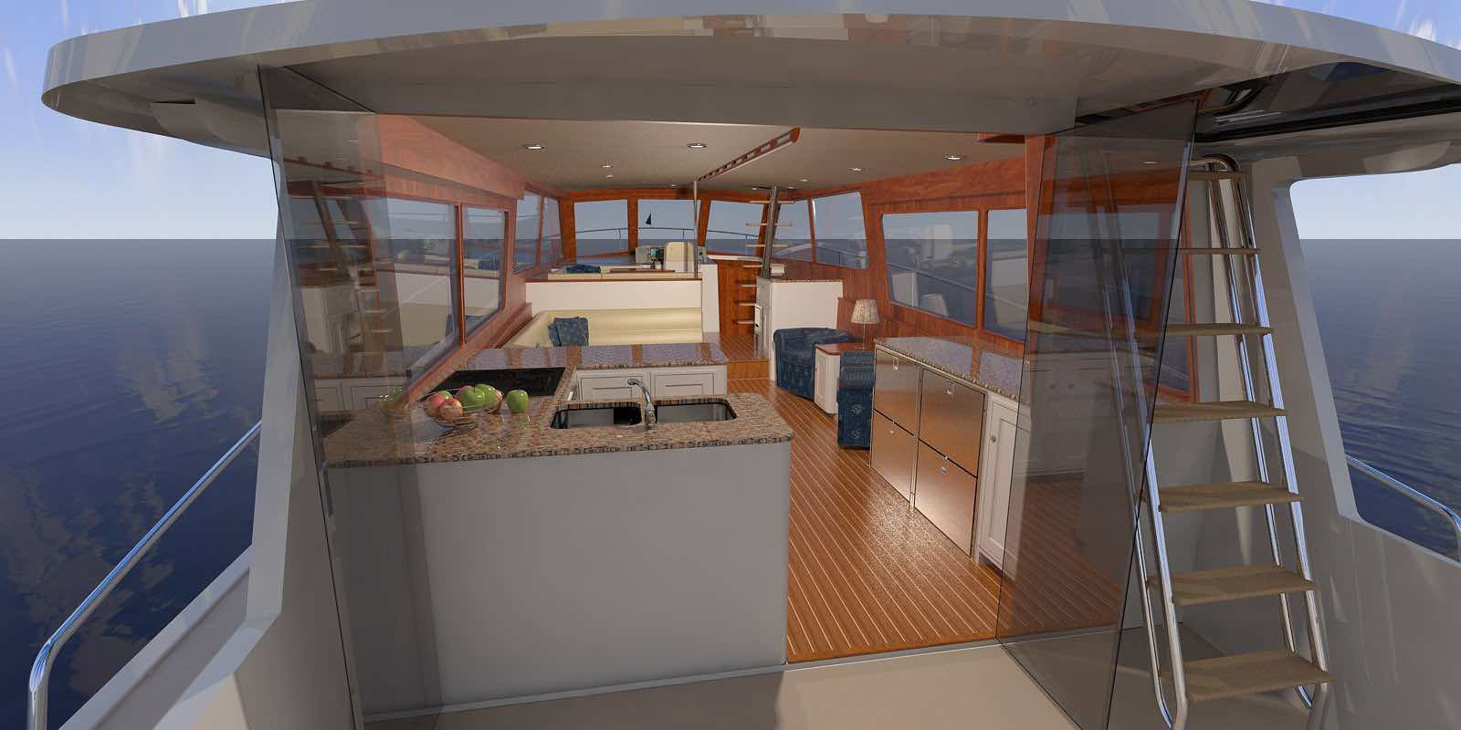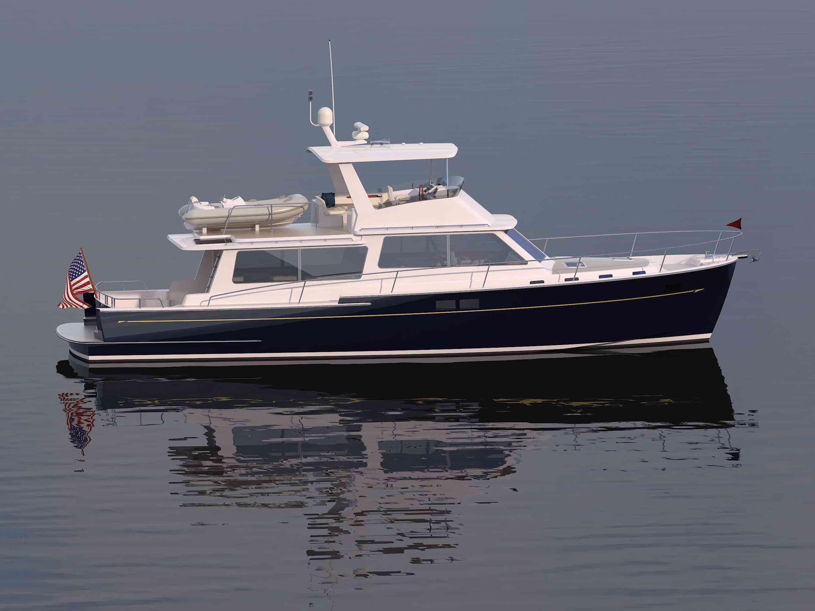 Duffield’s vessel will be built in the U.S., incorporating a West Coast-style superstructure, combined with a traditional New England-style hull. The boat will have a narrow waterline beam—a Zurn trademark—and be powered by a single Caterpillar C-18, mounted well aft away from the living space to ensure a quiet ride.