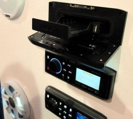 It’s not on the Fusion website yet, but the MS-BB300 black box marine stereo was introduced in Fort Lauderdale — press release here — and is scheduled to ship this month. In a way it’s Fusion’s first black box unit, but then again they built the trailblazing Simrad SonicHub in 2010 and then the Garmin Meteor 300 last year. In fact, the BB300 is very similar to the Meteor 300 and whereas Garmin acquired Fusion in May, the BB300 can be viewed as a statement about Fusion’s continuing independence. The Meteor may integrate with non-Garmin displays over NMEA 2000, but the BB300 promises N2K Fusion-Link integration with many current MFDs from Humminbird, Murphy, B&G, Lowrance, Simrad and Garmin. A further indication that Fusion is going to keep on innovating in concert with multiple partners was a preview look at four new marine stereo heads that will be formally introduced early next year.