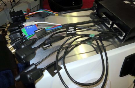 Now here’s a peek at the back end of the Fusion MS-UD750 that will become a flagship control head unit sometime in 2015. Installers will appreciate how all the connectors are on pigtails, and I think everyone concerned will be glad to see the standard NMEA 2000 connector. The unit will still be able to join a network or create one, but no confusing adaptor cables will be needed because power to the network will be turned on and off from the setup menu. One of the very last non-standard N2K connectors bites the dust. Hurray!