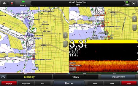 This screen may be helpful as it shows G2 charting for the whole downtown area with the Contender 25 parked in its home slip where I later spent more time with the Fantom radar. Note that by this point I’d gotten the Panbo test Virb XE waterproof camera networked with the 8617 MFD. In fact, I made that connection on three different demo boats, and I think the Virb XE integration is even more sensational than whenit first wowed me in Baltimore.