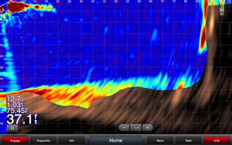 Adam already explained that thePanoptix transom transducer was temporarily mounted with a pole and suction cups for this demo, and the little boat icon upper right in the LiveVü Forward window shows how its internal heading sensor knows where it’s pointing relative to the boat. Finally, note the distinct pole-like object seen on the left side of the SideVü window, because it’s a day beacon that we used to test the new FrontVü collision and grounding avoidance view coming to Panoptix Forward looking sonar.