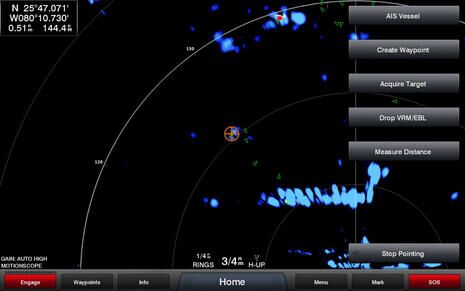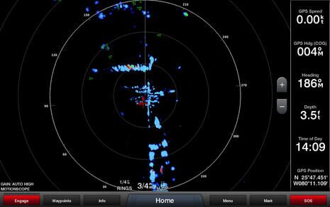 On this screen the radar is still in 3/4 mile range, but I’ve used the 8617’s multitouch screen to zoom in on the big bridge and the targets beyond. I’m not sure I’ve seen that radar viewing capability before and it seemed useful, especially since you just tap the Stop Pointing button to go back to normal. If I had managed to capture the AIS info we tapped onto the screen, you’d see that the vessel was Mark Cuban’s 288 foot Fountainhead which was tied up to the new Island Gardens megayacht marina on the west side of Watson Island. That’s a big target, but still the Fantom was picking it up from a low mount on the 25-foot center console and either through or over the huge concrete bridge supports.