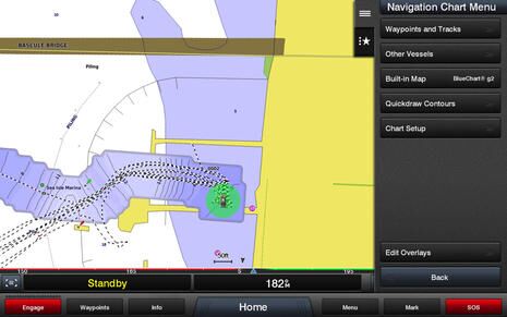 Another of Garmin’s many February announcements was BlueChart g2 HD Charts with Auto Guidance 3.0 and other enhancements. We only got a brief look at the new Auto Guidance, but it does seem able to handle narrow and complicated waters much like the impressive Navionics Dock-to-Dock (supposedly coming soon to Raymarine MFDs). On the screen above you can see how AG3 has calculated a route under the downtown Miami bridges and is also warning us about some submerged pilings ahead (why it didn’t route around them I don’t know).
