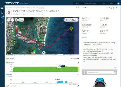 For instance, it only took a few Quatix 3 button pushes to get the watch into “Fish” mode — though, my bad, the start icon is about halfway through the successful sailfishing afternoon that Adam gleefully covered — and few more once we tied up. Fish mode, like many other “Activity”apps you can load into the watch, starts the GPS and brings up a couple of relevant data screens (I could record fish catches and set a tournament timer in this case). And, just like hikes and other activities I’ve recorded with the watch, the data automatically went up on my personal Garmin Connect website (above) and also to the Connect app on my phone.
