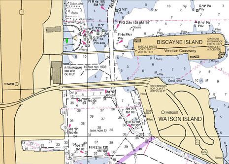 At any rate, here’s a zoomed-in screen of the Sea Isle Marina and the low Venetian Causeway (also known in that section as a bascule bridge and so nicely detailed on the raster chart). You can see that Quickdraw Contours presumes water depths right over charted piers and other objects just like the Navionics Boating app’s SonarChart Live does. The big difference right now is that the underlying sonar logs get uploaded to Navionics and processed into the more rational SonarCharts that many Navionics users can download to the app or to a Freshest Data card that can display on many MFDs (this Navionics PDF includes Garmin MFDs, but there’s big caveat to that).