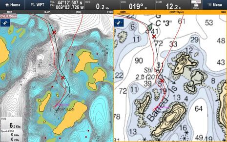 And now for a 100% positive shakedown experience. When I casually tested the slick Raymarine sonar log uploading feature that Navionics recently added to its mobile apps (see end of entry), the data apparently included at least one past trip to this somewhat daunting-looking Barred Island anchorage. A few weeks ago the SonarChart seen at left had the deep water detail (probably from the older fishing bathy data that was somewhat confusingly folded into SonarCharts), but no detail of the anchorage, where the official chart is also quite vague about depths. It was real kick motoring in there with the new SonarChart I updated on a Navionics+ card, seeing useful info I’d collected myself and that is now available to every boater with access to SonarCharts. I’m collecting sonar logs regularly now — it’s nearly painless — and am up for trying any other easy sonar data sharing system. Navico just announced community-sourced Social Map, for instance, and — cool! — UPS just delivered the test NSS7 evo2. I have an install to do this afternoon 🙂