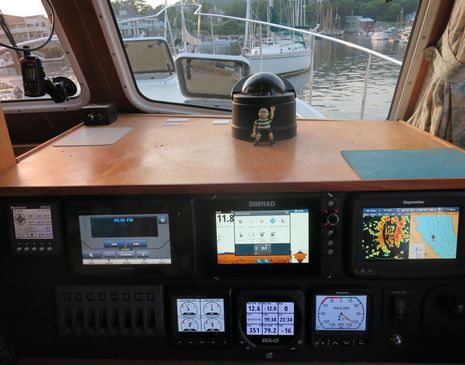 PS 7/2: A fully loaded lower helm panel is way better than one with a hole in it, and initial testing of NSS7 evo2 very encouraging. Plus for this photo I set the instrument screens in tentative “on the hook” mode.