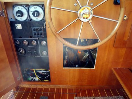 Gizmo’s orginal engine gauges are not gone, but they are now tucked away in the flybridge console and in this main cabin wiring cabinet. I even created a new wiring access hole (which will get a nice door eventually), which also opened new space for the various black boxes behind the scenes.