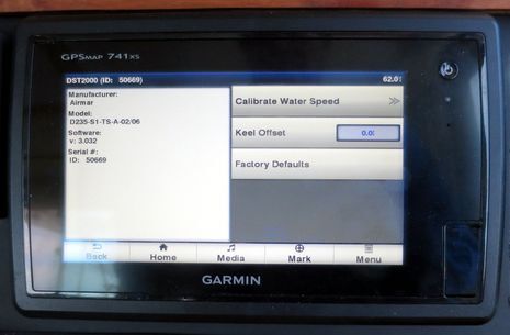 The CE screen also shows STW (Speed Through the Water) almost two knots under SOG (Speed Over Ground). This is not due to a strong following current — millions of lobster trap buoys give us lucky Mainers nearly constant visual current info — but rather the fact that the poor paddlewheel is located right behind the protruding transducer used by the EchoPilot FLS (I haven’t finished wiring yet). It would be interesting to see if the disturbance to STW can be overcome with calibration, but while the Garmin system seems willing to give it a try, the results are just an error message. Perhaps the DST2000 Airmar loaned me years ago needs a firmware update before it can be calibrated?