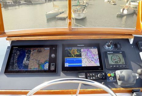 The glass bridge concept also isn’t exclusive to large, expensive MFDs. Once the Simrad NSS7 evo2 arrives, Gizmo’s lower helm will have three panel-mounted 7-inch touch MFDs each networked to their bigger siblings above as well as radars, sonars, and lots of NMEA 2000 sensors. (Furuno doesn’t have a contender in the hot 7-inch touch category — the relatively new GP1870 plotter/sonar looks a powerful value, but a TZT sibling it is not — though then again the TZT14 can closely integrate with MaxSea or Nobeltec TimeZero running on a PC like Chart Table 21). Once the first-generation NSS8 goes back to Simrad, Gizmo’s lower helm will also have much better sight lines than it used to.