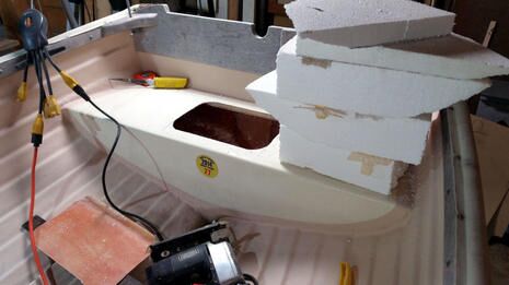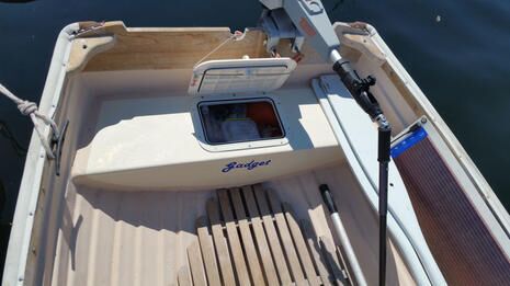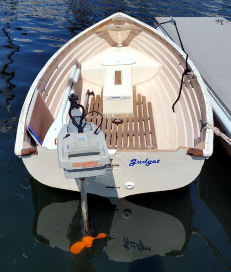Yes, I cut large holes into the beautifully-built Fatty Knees 9 tender dubbed Gadget and permanently removed perfectly dry flotation, but please don’t call me nuts until you understand the whole scheme. The formerly waterproof aft and forward seats now contain a total of five PFDs with room for small gear plus an almost completely invisible but powerful bilge pump system.