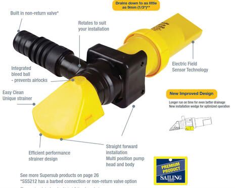 Whereas the Fatty Knees has an unusually full and deep keel, I was able to cut another hole low in the aft seat face such that the svelte Whale Supersub 1100 pump illustrated above fits inside the seat with its 2.4-inch wide strainer facing forward at nearly the lowest possible point. In hose testing the pump with its solid-state high bilge sensor drains the boat quickly and nearly completely, and I know that I’ll be able to get even closer to dry perfection by lifting the tender’s bow either from the dock or Gizmo’s swim platform.