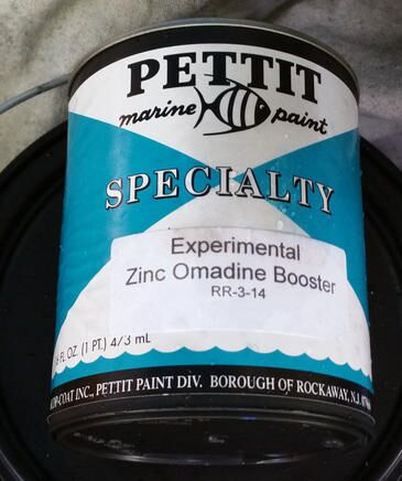 But is the 4.8% Zinc Omadine in Hydrocoat Eco (and several other Pettit formulations) good enough for surprisingly slimy Camden Harbor? I’m confident that the paint is applied properly this time, but half of it also contains a booster that Pettit is experimenting with for extra difficult locales.