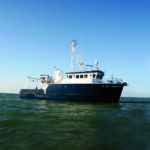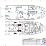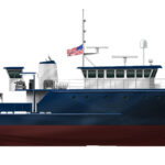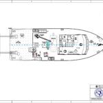 The hull specifications consist of a combination of plate thicknesses. “The side plates from the chine to bulwark cap are ¼-inch and the bottom plates from the chine to keel are 5/16-inch,” said Jeff Keunning of Boksa Marine Design. “There are several inserts of ½-inch at the bilge keels, the propeller nozzle, and the rudder area. Also there is a 5/16-inch cutwater from the stem back 12 inches. This runs parallel to the curve of the bow from the cap rail to the chine.” When I asked Jeff about the bulbous bow configuration, he said, “I hesitate to comment as there are significant differences in opinion on the effectiveness and advantages of the bulb bow.” Forward of the 400-square-foot stern work platform there are two cranes, towing equipment, and work boats, as well as a central entrance to the lab area with a dry lab to port and a wet lab to starboard.