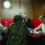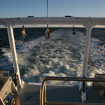 Shortly after clearing the mouth of the harbor we headed directly toward the sunrise. I joined Captain Coy and the first mate, Ryan Healy, at the helm on the dark bridge, illuminated only by the glow of large navigational screens. Below, in the saloon, scientists began to gather for breakfast. Seated around two tables drinking coffee, reading the paper, and talking about the day’s voyage, they eagerly awaited the chef, Patrick Foster, who was about to serve breakfast from the adjacent galley.