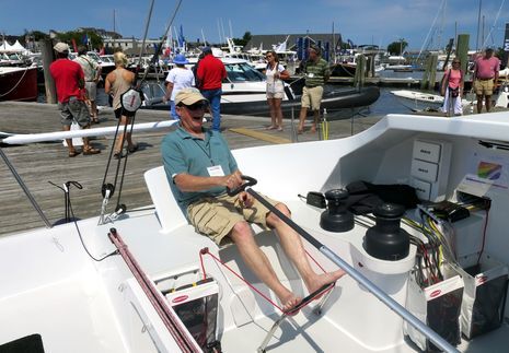 Another very different sort of vessel is the little unmanned satellite-connected bluewater sailboat that Educational Passages offers to schools to help with ocean science awareness. I wrote about the program in 2009 but first met solo circumnavigator and the non-profit’s founder, Dick Baldwin, on Sunday at the show. It was fun to hear about how far some of the boats have meandered and how often they’ve been relaunched by friendly foreigners. Dick described the excitement after school announcements of a transatlantic completed or similar milestones, and it seemed obvious that his infectious enthusiasm is key to the program’s durability.