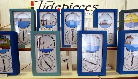Of course, I’ve skipped a lot of handsome and beautifully crafted Maine-built boats in favor of the more unusual sights at the 2014 MBHH Show and also many interesting exhibits in the tents. But I will close with one neat gadget I’d never seen before. Tidepieces aren’t just tide clocks with a clever illustration added; the water level “in” the illustration raises and lowers with the real tide level as nicely shown in this video.