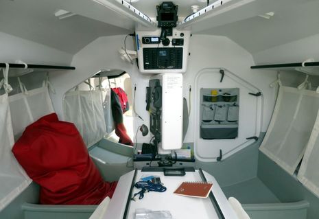 The system on Amhas is heavy on B&G, particularly H3000, like what you’ll see listed for what’s now called the Standard Akalaria Class 40. But that is a Furuno GP33 mounted up there between the internal rope and cable runs and also an Echomax active radar transponder. And there is a Zeus MFD mounted on that swiveling nav center, though Brian isn’t very pleased with it. “Too heavy,” he said, which is also why the boat is fitted with an older Navico analog radome instead of a 3G or 4G solid state unit. With the RC3 coming in at 4500 kg (9,921 lb) minimum class displacement, they’re working hard to keep her that way. Hence the all cloth pocket storage, beanbag chair/bed, and a galley that seems to be a single gas burner (and probably one aluminum pot).