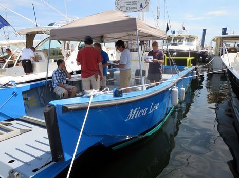 If the fit and finish of the utilitarian (in its own way) Akalaria RC3 was well beyond “good enough”, ditto for the sharp aluminum workboat being shown off by Dock Works of Winterport, Maine. Unfortunately, there’s no detail about this 26-foot power catamaran on their website yet, but I can assure you that I’m not the only recreational boater who daydreamed about skipping around the coast at 30 knots — hull #1 Mica Lee has twin Volvo Penta 225hp diesel outdrives — with maybe a picnic table, tender and bikes on the work deck. In fact, that’s my buddy Peter Smith checking out the price list, and he came away so bug-eyed I think I’ll let Dock Works reconsider before I suggest how relatively easy it is to own this able vessel.