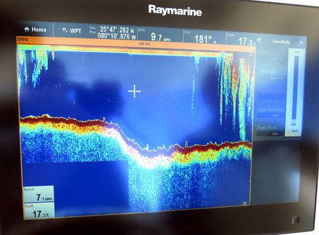 “Black is the new gray,” say the folks at Raymarine, and so it is with the three new CPx70 sonar modules which were introduced in Miami. They’ll replace the existing blackbox fishfinders but not the CP100 and 200 CHIRP Down-or-Side-Vision and sonar combos designed for shallower depths and structure imaging. So the 600-foot-max-depth CP100 also installed on the demo boat above highlights by contrast the beefiness of the CP370 model, which is actually the bottom of the new line with its traditional dual 50KHz and 200 KHz fixed frequencies, 1,000W of power and purported depth range of 5,000 feet. The performance enhancements seem subtle but multiple.
