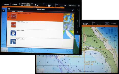 I’ve already mentioned C-Map’s delight about Raymarine’s new support for its 4D chart packages, and here are some photographic attempts at showing how good it looks. Available are three levels of C-Map 4D, starting with the stripped down Essentials subset that comes bundled with many new Raymarine MFDs, then 4D-Max with many added features (especially for fishermen), and finally, C-Map 4D-Max+ which includes complete paper-like raster chart coverage in addition to the 4D vector charts. Thus, a 4D-Max+ card that covers the Bahamas includes the original Explorer Charts and coverage of most foreign coasts includes the official hydrographic office paper charts.