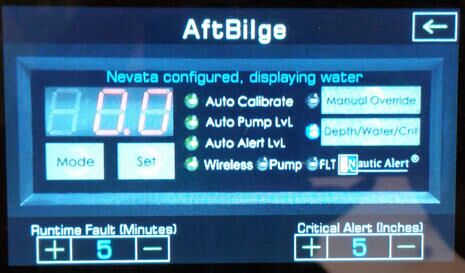 Nevatas may well be the most expensive bilge pump switches in the world, but don’t presume a value judgment until you understand all they can do. Once I’d completed this temporary install in Gizmo’s aft bilge, I easily used the switch’s button and LED interface to invoke the Auto Calibrate mode, which meant it used its abilities to “hear” the water level and sense the current passing through the pump to establish its precise pump-dry level. (14.0 inches is the distance between the Nevata and the bilge water level or floor, and the screen can be set to show either that value, water height or accumulated pump cycles.)