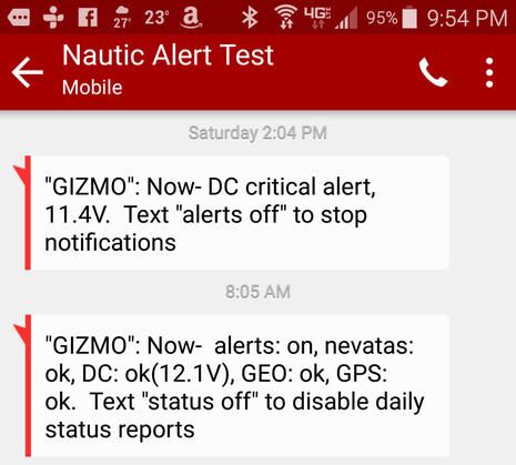 Tip useful for any text-based monitoring system: The phone number I’m using here is actually a free Google Voice number, not my cell phone number. That way I can also converse with the Nautic Alert via email, using my phone or most any connected device, and my phone texting is a separate thing (unless I also register its number).