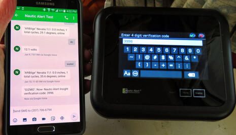 I could go on and on, but here’s a photo illustrating how a Nautic Alert platform user sets up a phone for text alerting and data inquiries. It’s done right, of course, — the system sends the phone a verification code that has to be entered on the Insight — but it’s easy via the general setup menu always available under the gear icon. In this particular case the phone number had already been set up once, hence the early January “conversations,” but I had to do it again after the firmware update.