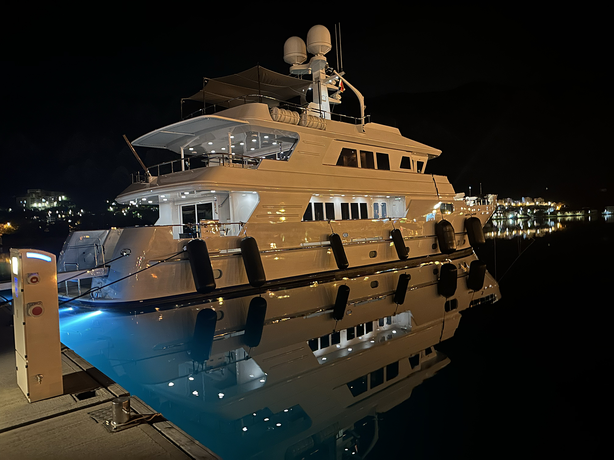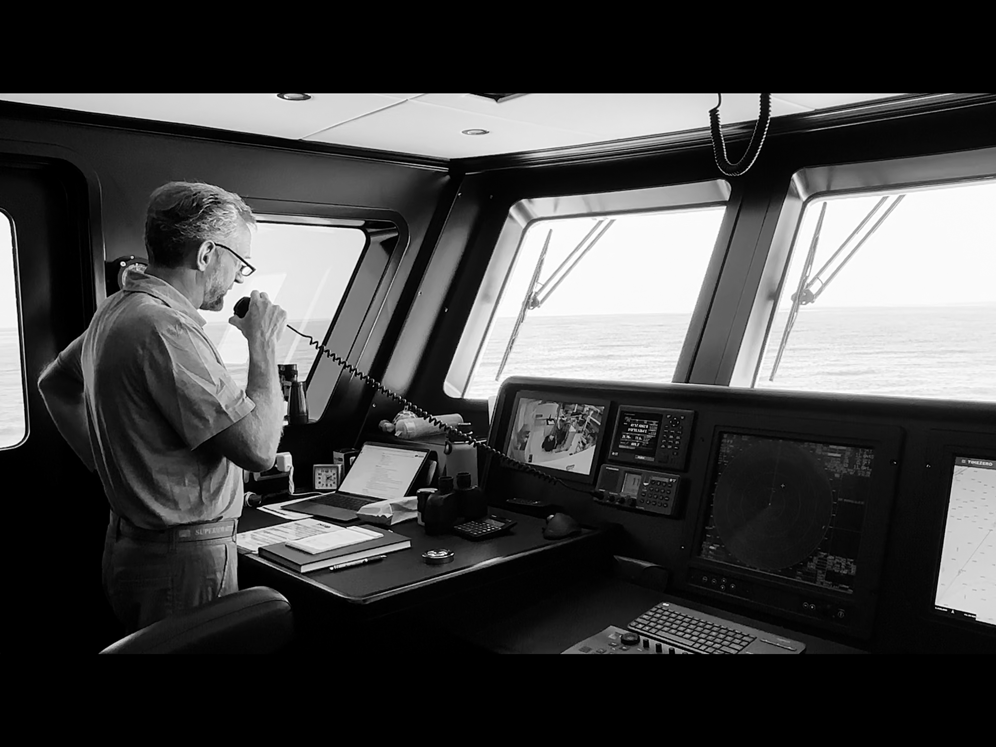 Relentless has a lot of black boxes. They make me feel curious and intimidated. Every available space in the pilothouse is filled: Hatteland multifunction displays, two 96-nautical-mile commercial radar screens, a GPS plotter running MaxSea software, and a system alarm and monitoring screen. There’s also a Sperry autopilot with a gyrocompass, a Quantum zero-speed stabilizer system, and various Furuno systems such as GPS and commercial AIS. Starlink lets the crew watch movies on the 75-inch salon TV.