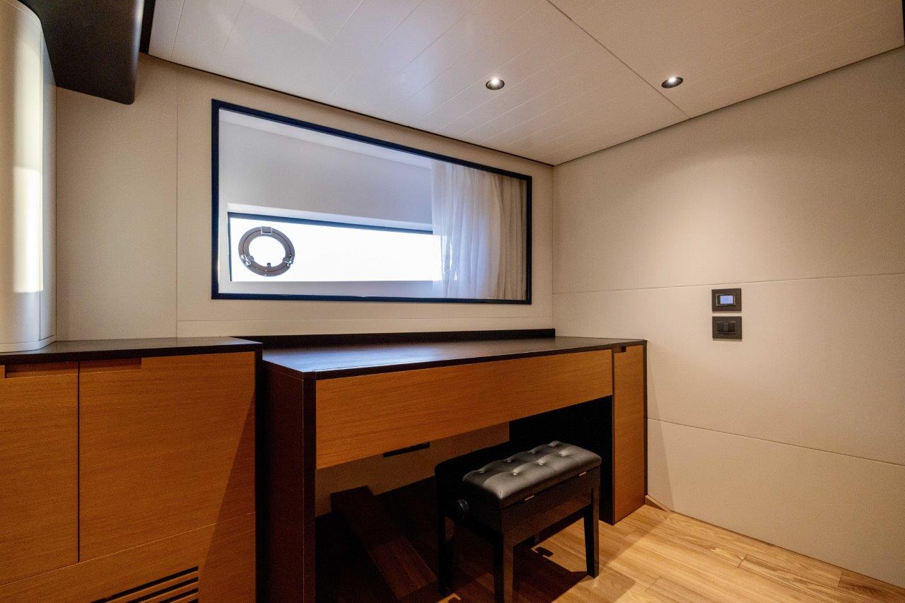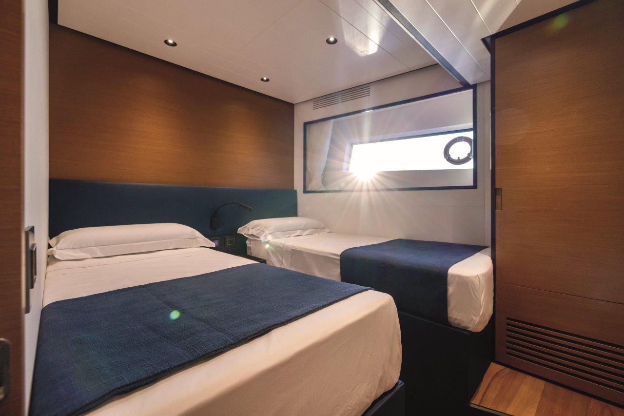 Below decks, Hull No. 1 has a four-stateroom layout—a full-beam, amidships master, forward VIP and a pair of staterooms with bunks; all are en suite. Owners will have the option of having up to five staterooms and crew quarters for four.