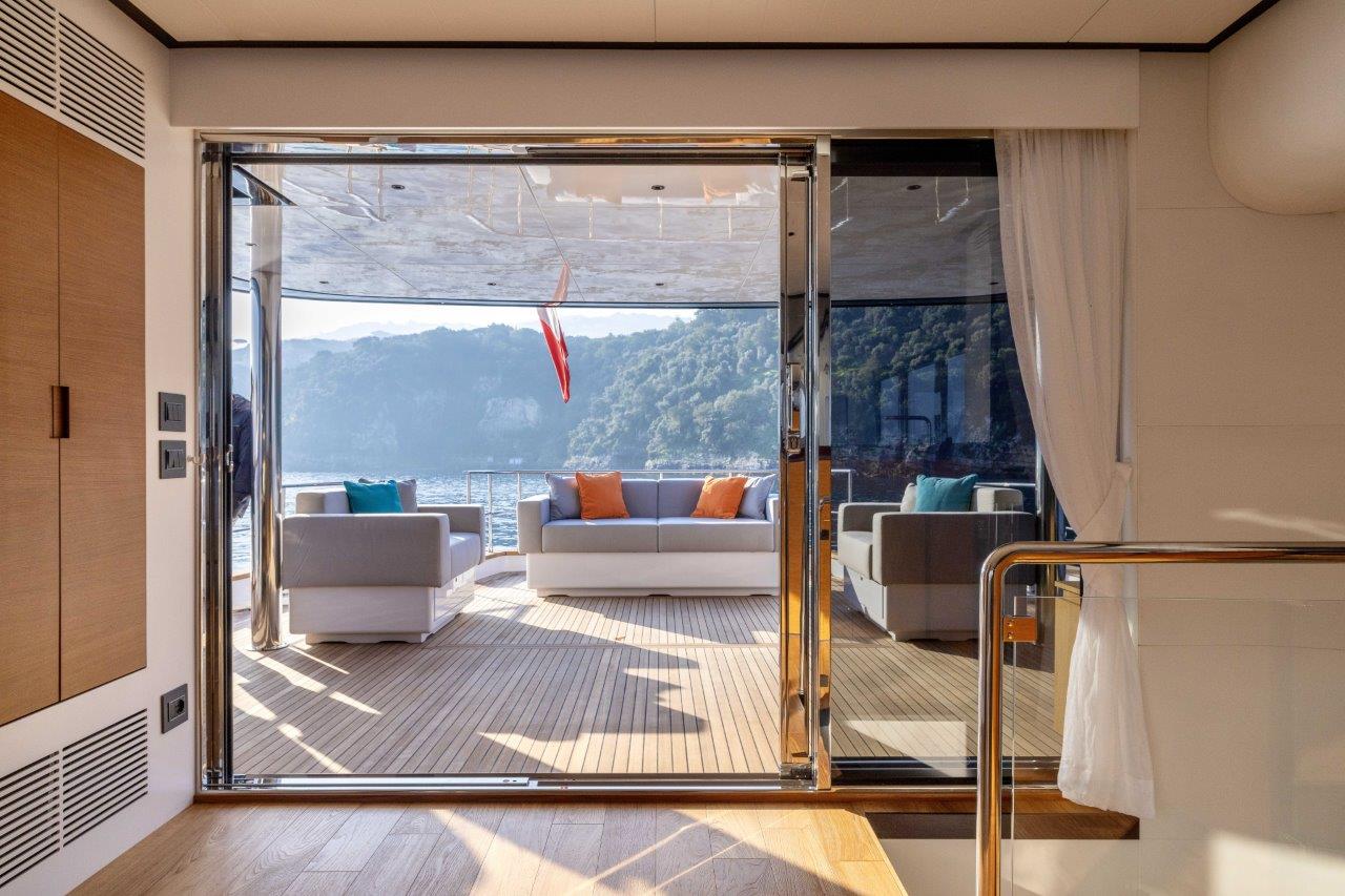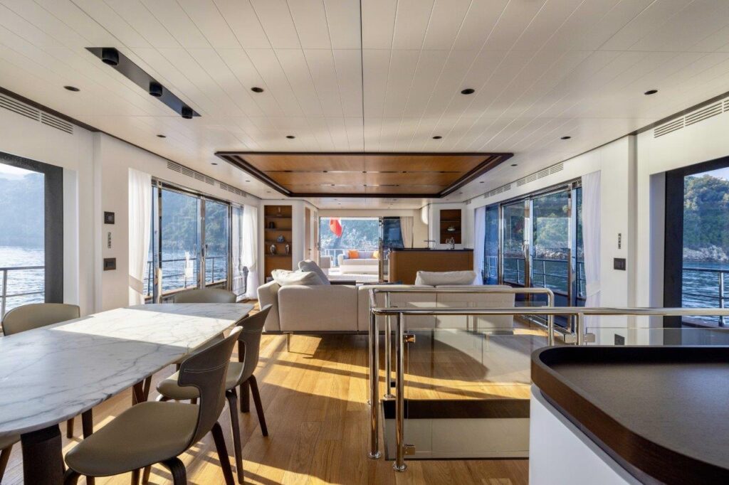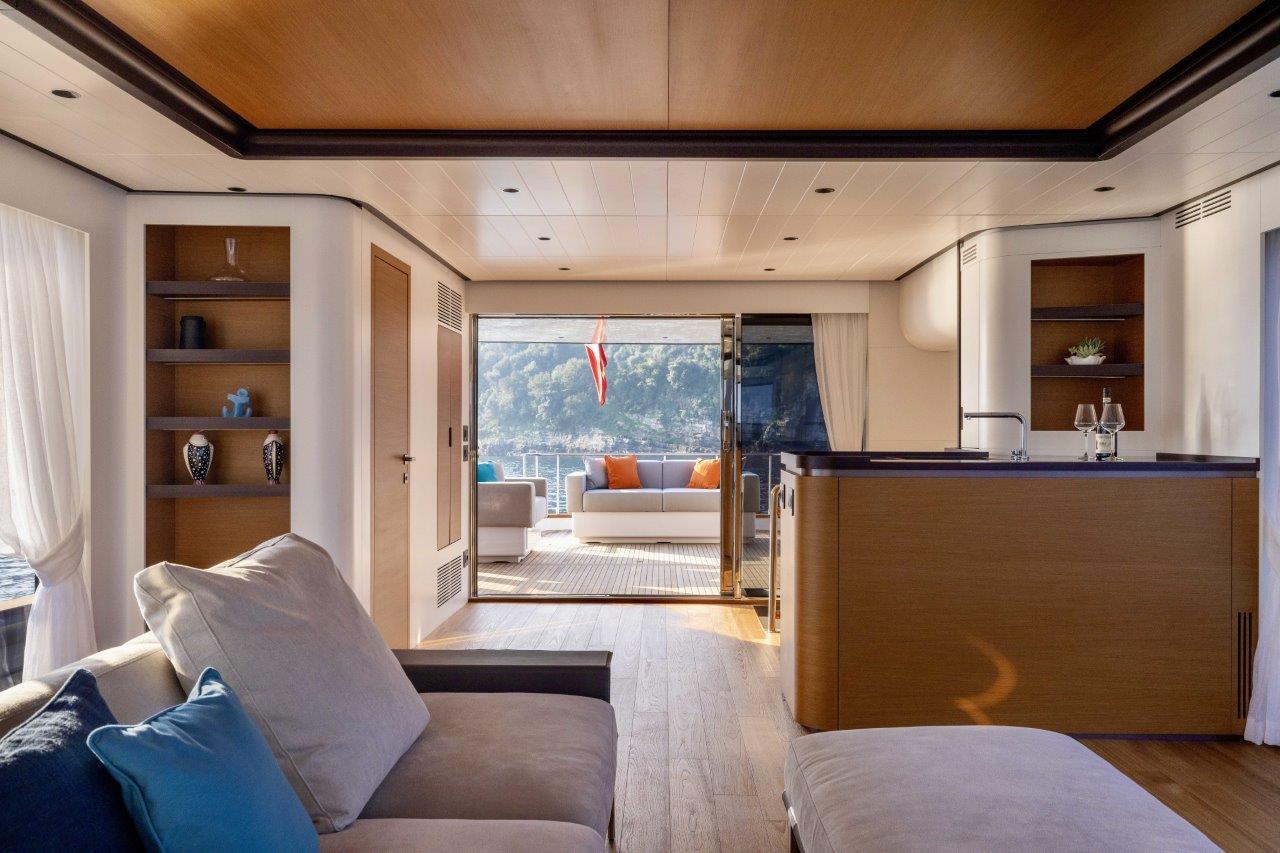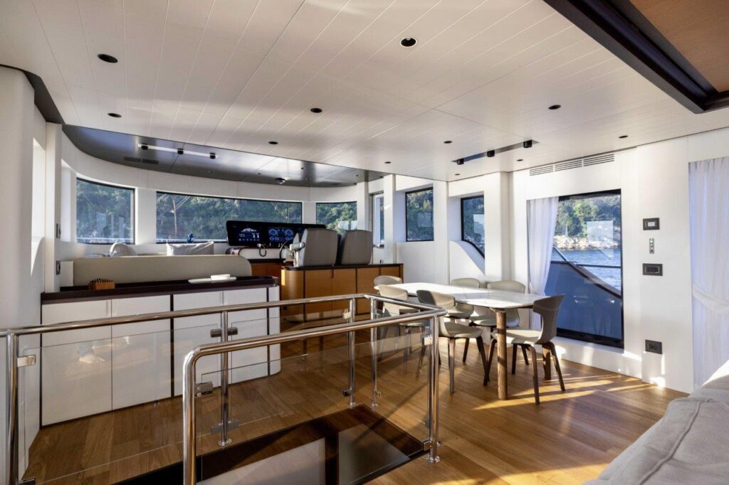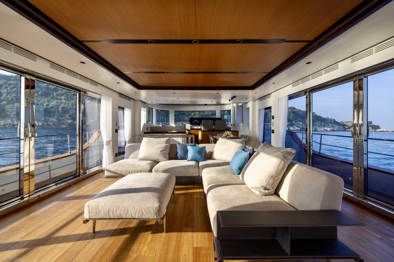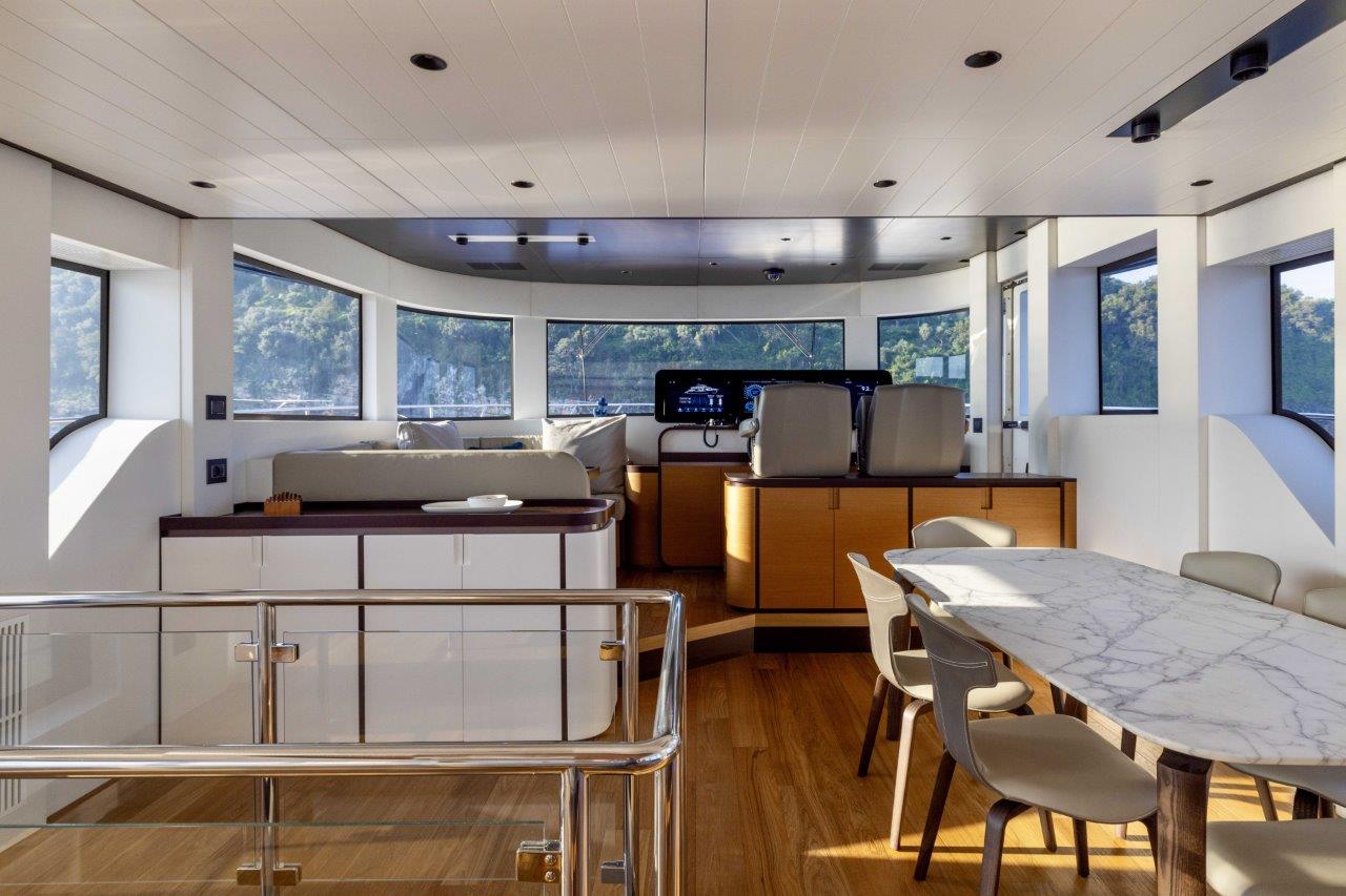 Other notable features include custom furnishings from Italian design house Poltrona Frau, a garage that can house a tender up to 13 feet and a large solar array on the flybridge hardtop.