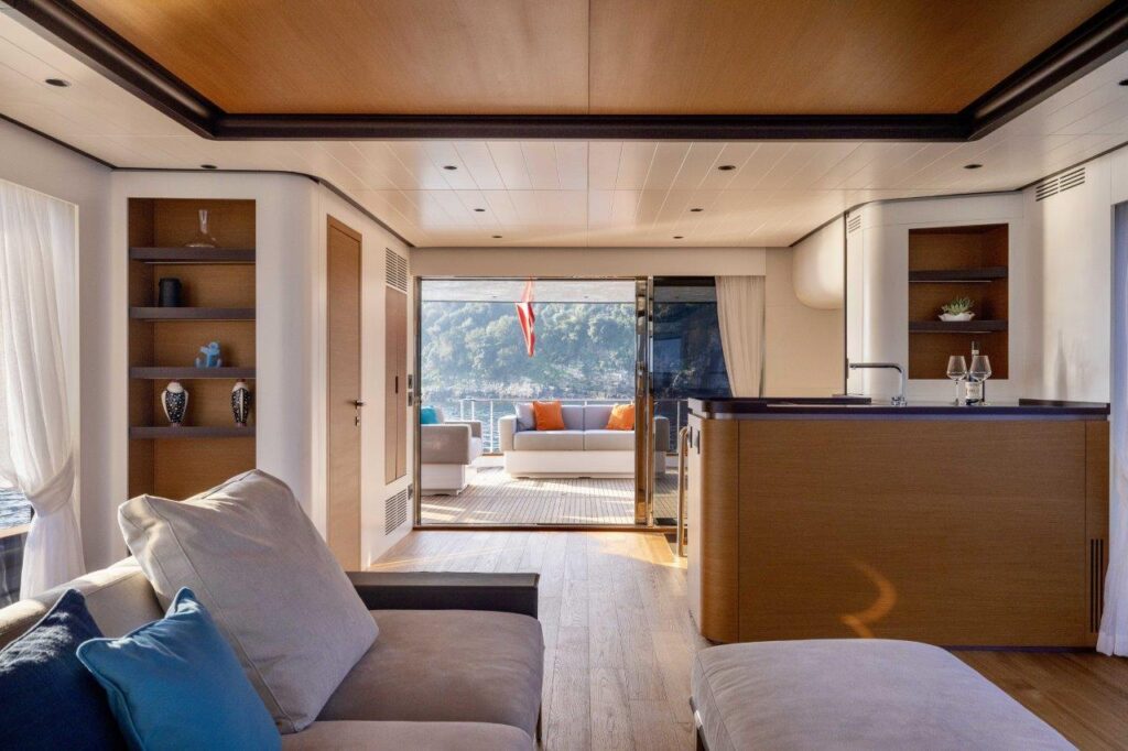 Outdoor spaces are expansive on the Apreamare flagship. Both the cockpit and foredeck lounge offer sunpads and seating in full sun or shade. But the flybridge may be the catbird seat, with commanding views, room for what looks like a baker’s dozen of guests and a galley with wet bar, icemaker and cold stowage.