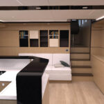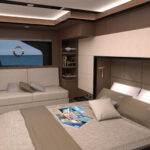 New layout of the master stateroom in optional dark walnut with leather