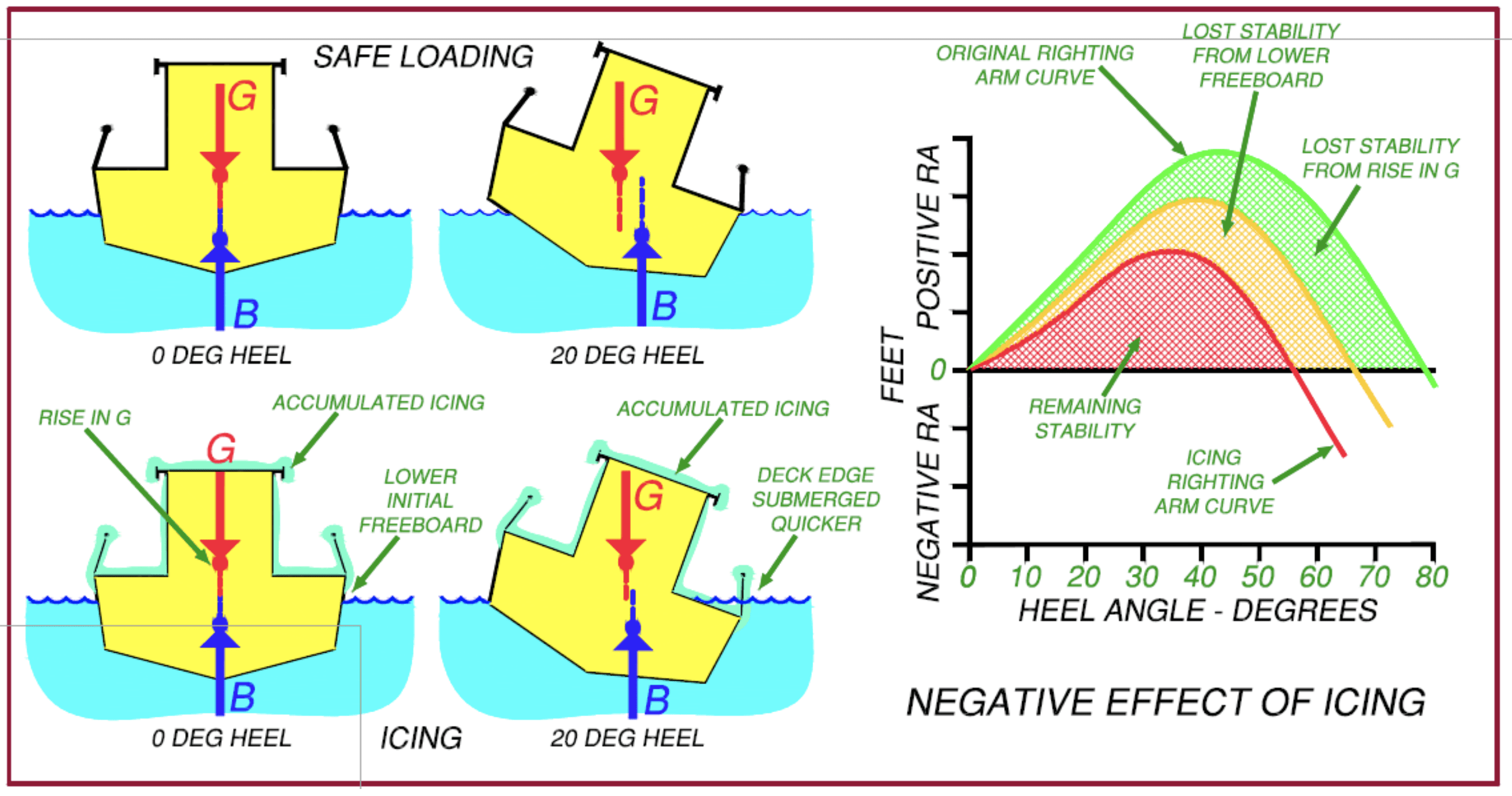 “The MSC concluded that the vessel likely capsized in the large seas and winds as it came out of the lee of St. George Island due to prolonged icing conditions adding weight high on the vessel, leaving it with a lower freeboard and a decreased righting arm (lower stability). The AIS position data that indicated a rapid heading change as the vessel left the island’s lee support this capsizing scenario.”