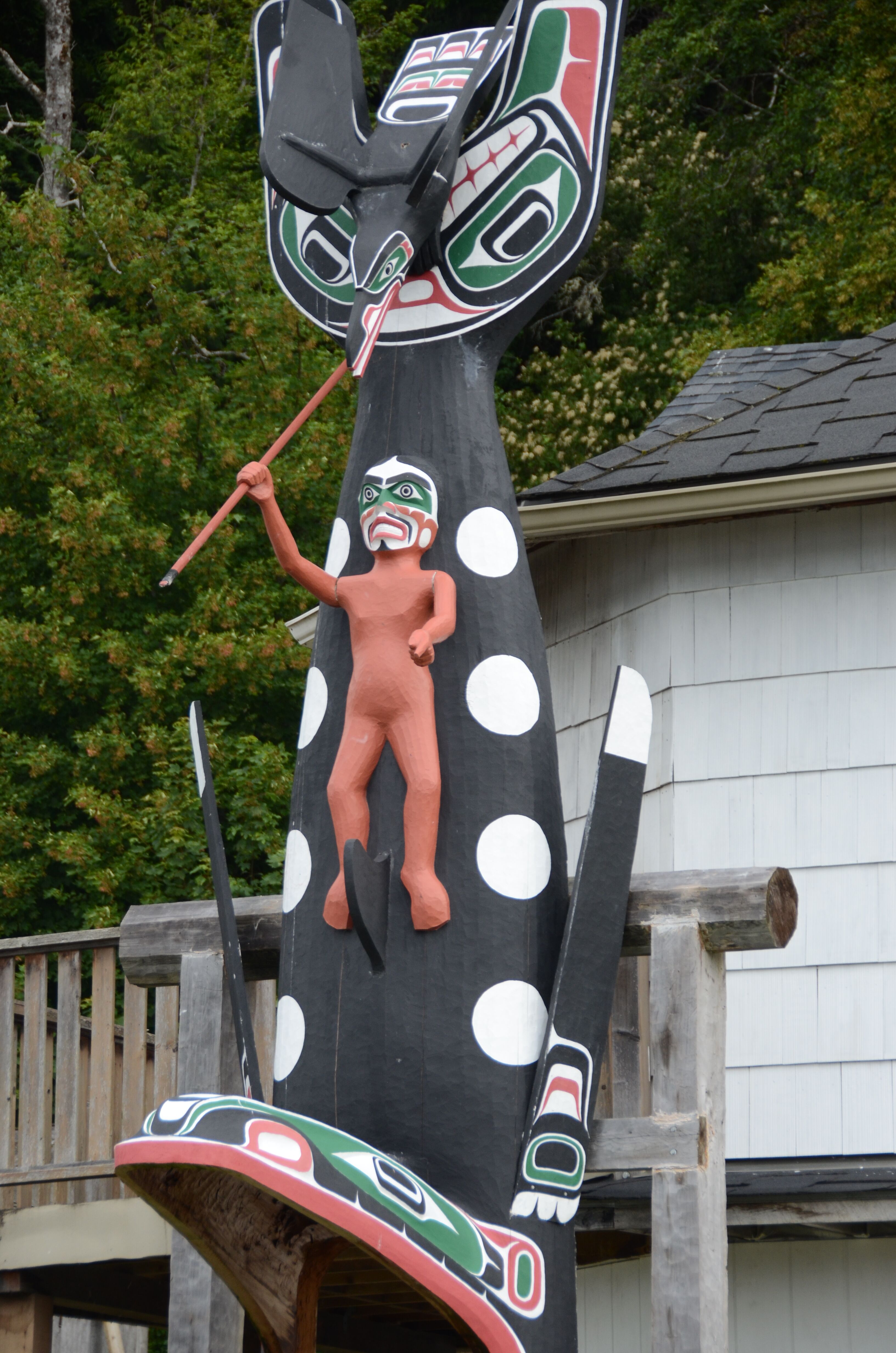 Up the hill from U’Mista is a community “big house” modeled on traditional buildings of early tribal groups. The entire front is a huge painting/carving featuring the raven and other creatures of the land and sea. New in 1999, it primarily is used for community activities.