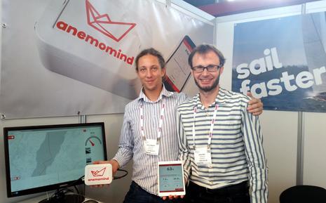 Xavier Righetti and Julien Pilet pose (above) in their first METS stand with the three tangible elements of Anemomind. The white box contains a fast GPS receiver plus barometric pressure and 9-axis inertial motion sensors, as well as NMEA 0183/2000 ports, WiFi, Bluetooth, and lots of computing power. The connected app delivers wind, boat speed, and percentage of target speed attained, and it also passes the data along with notes and photos to the Anemomind cloud for near realtime race analysis. That’s all good, but the special sauce is less tangible.