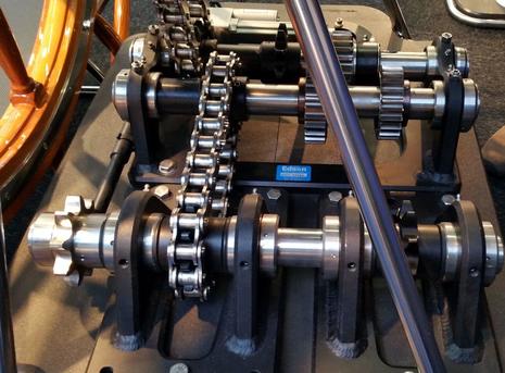 I’ll close with the distinctly non-electronic beauty of a fine mechanical steering system. At METS 2015 Edson Marine showed off half of a traditional looking superyacht system, Facebook photos here, that features dual-clutched wheels each with two-speed gearing to the rudder post, so the driver can manage the large rudder pressure at speed but also manuever quickly around docks. You can see the gear-changing ram at the back of my photo, but you need to be there to feel how silky smooth it all operates. Will Keene, who once gave me an Edson tour in New Bedford, told me how the gear fit and polish meet high AGMA standards, but the killer detail is how the middle shaft bearings are set in their frames with a slight eccentricity. If the gears ever do wear — which certainly won’t happen fast since they start with near zero slop — it just takes a little wrench work to tighten the system. I was impressed, but a much more significant endorsement of Edson expertise is their latest superyacht commission, which includes 27-inch diameter rudder posts (PDF here) and an owner who apparently wants to feel those rudders in action!