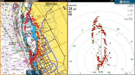 That’s exactly what’s happening on this screen with a Simrad Halo 3-foot open-array radar set to 24-mile range but painting Biscayne Bay as far as 32 miles away with the windows in “look ahead” mode. As with all the demos, the radar antenna is installed about 10 to 12 feet off the water on a T-top so radar horizon is definitely a factor, and checking the charts and satellite photography I don’t see much in the way of high, hard targets way down that bay. Thus, I think this looks quite good for Simrad Halo and solid state in general, and I’m bringing it up now because long range performance is the aspect of ss radar that informed boaters worry about the most.