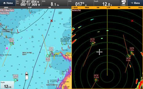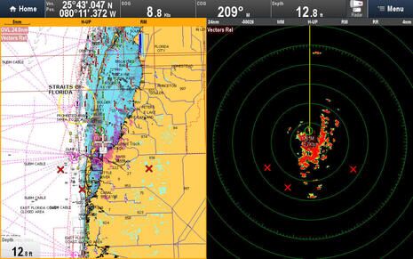 Now, here’s the new solid-state Raymarine Quantum 24-inch radome at its maximum 24-mile range, with results I’d guess similar to its most direct competitor, the Simrad Broadband 3G, but not as good as some smaller magnetron radomes like Ray’s own RD418HD (which I’ve been long testing on Gizmo since 2009). Note how the low Florida mainland peters out at about 8 miles, though one good target is visible at about 19. (I think it may be the Turkey Point Nuclear Generating Station, but the out-of-whack overlay and even the available charts don’t help.) But we’re talking about this radome’s longest claimed range, which many boaters may never use for navigation (thanks, GPS) or distant collision avoidance (thanks, AIS). Overall, my first Quantum impression is of a competent $1,600 radar with some neat possible updates in its future and a genius install option already available. You’re looking at radar data coming to the MFD over WiFi, which means that most any radome can be replaced with a Quantum without replacing the cable; it’s not the ideal way to go, but you or your installer can simply find the two power wires in an existing radar cable (that may be inextricably buried in your mast), splice them to a Quantum pigtail and then set up your Ray WiFi to include the radar. Done!